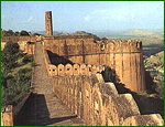 This fort stands on a top hill, overlooking the palace and city of Amber. The world's biggest cannon on wheels - the Jai Ban, built by Maharaja Sawai Jai Singh, is positioned here. It has a twenty-foot long barrel and wheels nine feets in diameter. For a single-shot from teh cannon 100 Kg. gun powder has to be pumped in. |